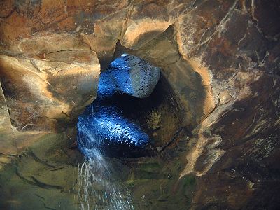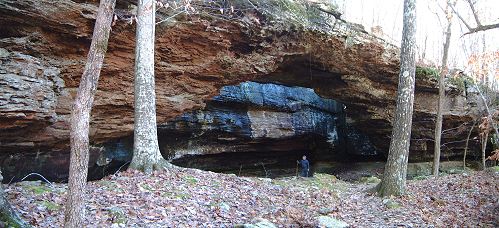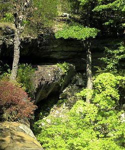 Lost Valley - 3.5 Mile Round Trip You'll love this hike, it begins at Lost Valley Campground just off Highway 43 between Boxley and Ponca. You'll discover the "Siamese Beeches", two trees that have grown together over the years; the "Jigsaw Blocks", another natural bridge; then Cobb Cave which is a giant overhang you can walk back into. It was named thus because of the corncobs discovered there that were left by Indians many years ago. After that take a walk up to Eden Falls, which are absolutely beautiful. Then turn around and come back to the intersection, take a right and go to the cave. Be sure to take a good light with you. You'll have to crawl a short way, but then it opens up into a large room with a 35 foot waterfall. |