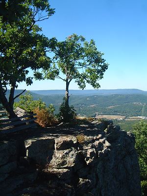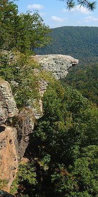 Hawksbill Crag is one of the most recognized spots in Arkansas because photos of it have been used in many publications about the state and the Ozark Mountains. It is an amazing rock outcrop that sticks out from a tall bluff located in the Upper Buffalo Wilderness Area. To get to the trailhead, head south on Hwy 21 and turn right onto County Road 5, Cave Mountain Road, 1.2 miles past the junction of Hwy 21 & 43. The parking lot is on the right .6 of a mile past the Cave Mountain Church and cemetery. From the parking lot, the trail begins across the road, goes into the woods and drops down the hill to a small stream. After it crosses the stream again, you will notice that the trail runs along private property which is marked with blue and red blazes - do not cross over. There are many science spots along the way but the most spectacular is Hawksbill Crag itself, one of the most major scenic spots in Arkansas.