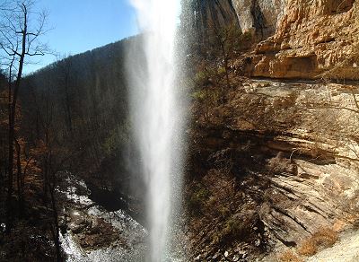 Point Trailhead - 5.4 miles One way to the Falls This trailhead is located 3.5 miles north of Ponca on Hwy 43 and actually follows an old road all the way to the Buffalo River. The 1300 foot drop to the River begins as a leisurely stroll down hill and gets steeper after the first mile. Along the way, you will pass other trails that lead to great spots like Chimney Rock and Granny Hendersons Cabin. You will also pass the Goat Bluff Trail to Big Bluff but unless you are a very experienced hiker it is not recommended because it is extremely dangerous out on Bluff and warning signs are posted. Even though this is a spectacular sight, the trail is narrow and the edge drops straight down about three hundred feet to the river so folks are not encouraged to take this trail. After passing this intersection, you are approximately 2.5 miles from another intersection which will take you to the mouth of Hemmed-In Hollow and a view of the tallest waterfall between the Rockies and the Appalachians. Compton Trailhead - 5.0 miles round trip To reach the trail head, take County Road 19 of Hwy 43 at Compton, travel .8 miles then turn right at the sign and the trailhead is just up the road. Two trails begin here but the one on the left is the quickest and also the steepest way to get to the falls. Its a quick trip down hill but the hike out will be a real test for the greatest of hikers. The other trail is longer and will take you past several special scenic spots along the way. From the River While floating the Buffalo, youll want to watch for the traditional spot that canoeists stop at to access the falls. Its just a short hike and to view the tallest waterfall in mid America is truly a memorable experience.