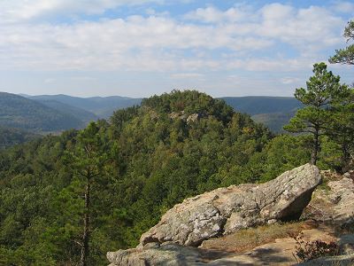 Round-Top Mountain - 3 Miles Round Trip Come enjoy some of Newton County's most spectacular vistas on this newest trail as it circles a well-known landmark. About three miles of trail passes towering bluffs, huge trees, including the largest stands of pawpaws in the area, and a very lush, diverse plant community. Enjoy spring's brilliant carpet of wildflowers or fall's fiery' beauty. Roundtop was the tragic site of a 1948 crash of a military plane and the former bluff shelter home of the earliest native people, which adds some historical interest on this trail. Access is south of Jasper about three miles on Highway 7. Turn right at the hiking sign to enter the parking area. A signboard with a map will help you plan your hike. |