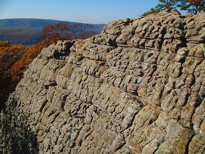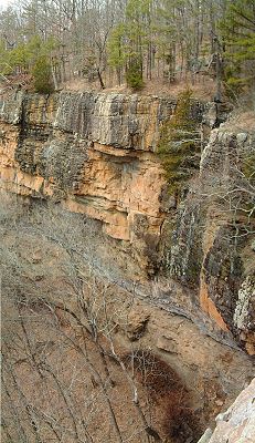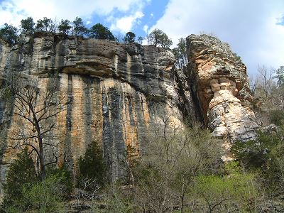 This portion of the Ozark National Forest is home to several different climbing areas. Sam's Throne is the oldest, and due to it's accessibility and high concentration of routes, the most popular. It's also one of the most traditional. Until 1987, all lead climbing was done on natural protection -- no bolts or pitons were used. The Atoka sandstone, with numerous crack systems, solution pockets, and knobs, lends itself well to gear. Creativity and strength help any aspiring leader while searching for sometimes elusive placements. The Throne is an excellent place for beginners; there are numerous moderate routes that one can top rope easily. More advanced climbers will find that while the grades seldom go above 5.11, the leads are quite adventurous. The first bolted routes in the area, Blind in Both Eyes (5.10+), Pass the Jug (5.10) and Exit Left (5.10), still maintain some of their traditional roots: all were put up on lead. On almost all of the routes with fixed protection, natural gear is still needed to fill in the gaps.